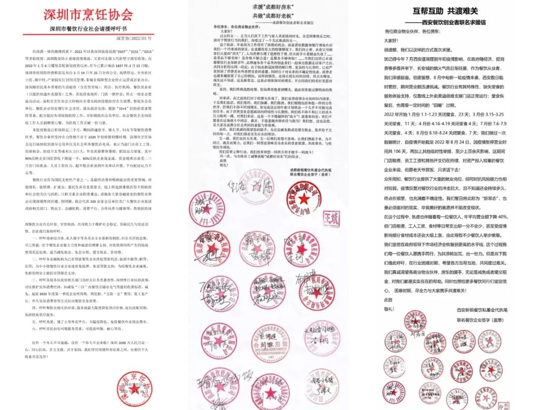 餐飲企業(yè)沒有放棄積極自救,同時深圳、成都、西安、上海等地的餐飲協(xié)會和企業(yè)發(fā)布倡議書,聯(lián)名求援。倡議集中在,呼吁政府提供政策紓困;金融機(jī)構(gòu)提供資金支持;號召物業(yè)減租減免管理費(fèi);外賣平臺降低傭金,解決運(yùn)力問題等等。
