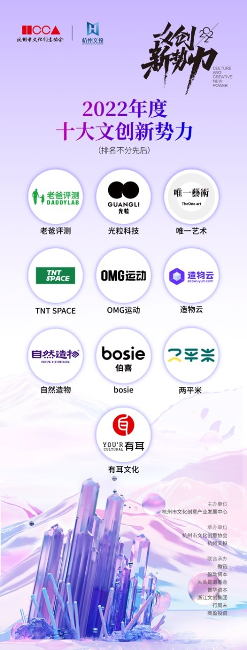 今年的文創(chuàng)新勢力活動自10月開始征集報名,共有92個項目參評,經(jīng)過初評、復(fù)評、總決賽等多輪評審,由專業(yè)投資機(jī)構(gòu)、金融機(jī)構(gòu)、行業(yè)專家所組成的評審團(tuán)最終評審產(chǎn)生各個獎項。老爸評測、光粒科技、唯一藝術(shù)、TNT SPACE、OMG運動、造物云、自然造物、Bosie、兩平米、有耳文化10個項目榮獲2022“年度十大文創(chuàng)新勢力”稱號。51CAMP等14個項目獲“創(chuàng)新潛力獎”稱號。
