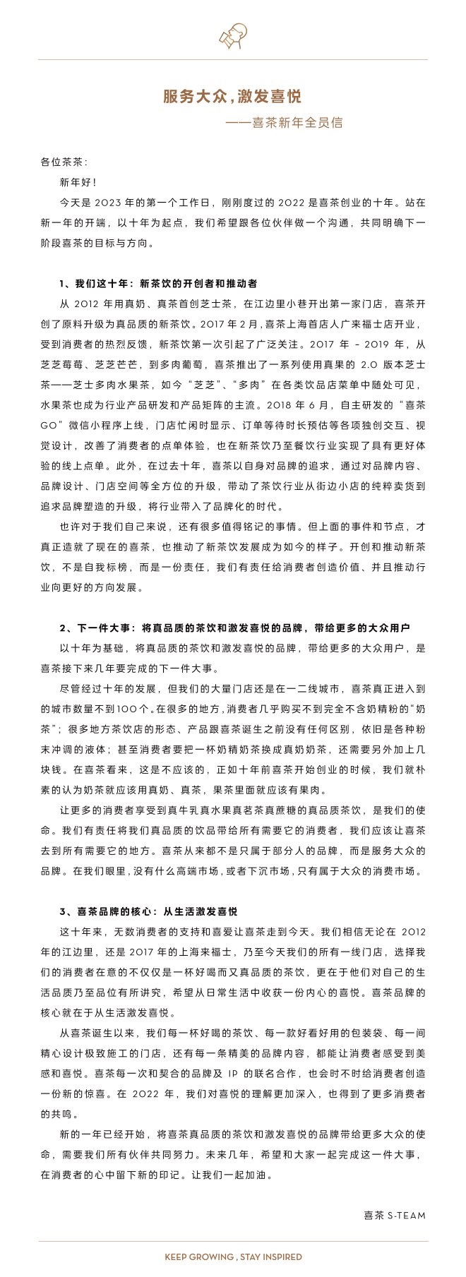 信中回顧了從2012年創(chuàng)業(yè)開始,過(guò)去十年喜茶在產(chǎn)品、品牌、數(shù)字化等方面的重要事件和節(jié)點(diǎn),及其對(duì)行業(yè)的影響!跋膊杵放频暮诵木驮谟趶纳罴ぐl(fā)喜悅”,喜茶高管團(tuán)隊(duì)在信中表示,喜茶接下來(lái)要完成的下一件大事是“將真品質(zhì)的茶飲和激發(fā)喜悅的品牌,帶給更多的大眾用戶”,“喜茶應(yīng)該去到所有需要它的地方”。