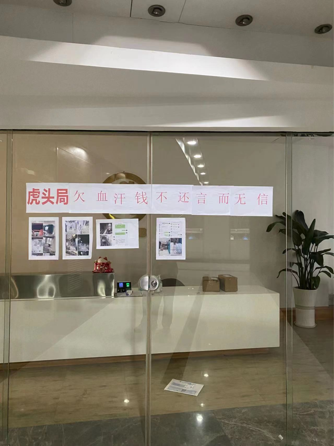 照片中大門緊閉,里面空無一人,門上赫然張貼著“虎頭局欠血汗錢不還言而無信”幾個字,字下還有幾張模糊的照片以及微信截圖的圖片。