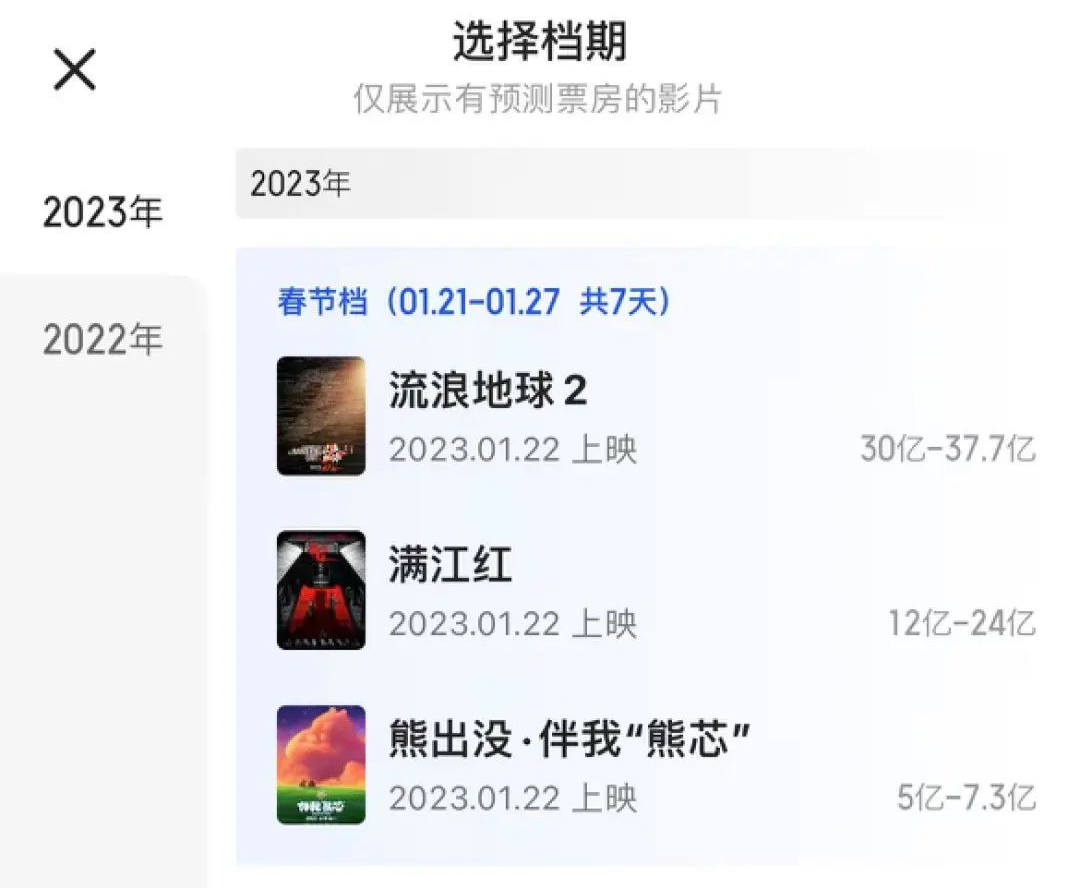 公開信息顯示,已有《流浪地球2》《滿江紅》《熊出沒·伴我“熊芯”》《無名》與《深!5部電影陸續(xù)定檔。其中,前三部影片,業(yè)內(nèi)給出的預(yù)測票房分別為30-37.7億元、12-24億元和5-7.3億元,預(yù)期票房之和達(dá)60億元左右,與2022年春節(jié)檔最終票房相當(dāng)。