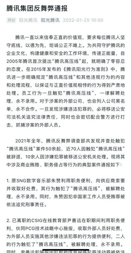陽(yáng)光騰訊披露的信息顯示,2021年,騰訊反舞弊調(diào)查部共發(fā)現(xiàn)并查處觸犯“騰訊高壓線”案件50余起,近70人因觸犯“騰訊高壓線”被辭退,10余人因涉嫌犯罪被移送公安機(jī)關(guān)處理。