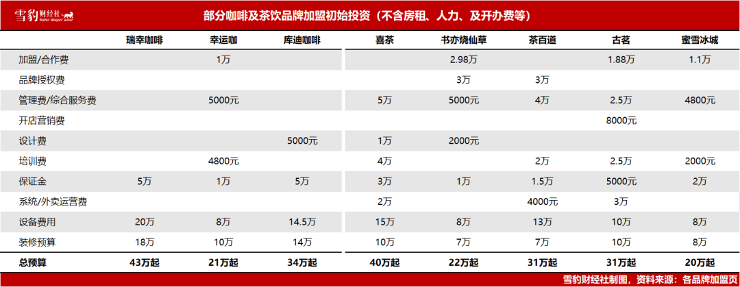 雪豹財經(jīng)社對比發(fā)現(xiàn),和奶茶品牌相比,瑞幸的初始投入主要貴在裝修和設(shè)備費用。三四線城市奶茶店的面積通常是二三十平方米,裝修成本1500元/平米,遠(yuǎn)低于瑞幸的18萬元。設(shè)備方面,咖啡店的成本是連鎖奶茶品牌的2~3倍。