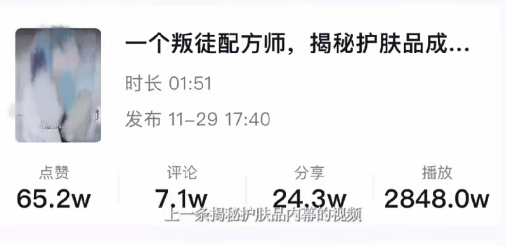 上述對話出自抖音用戶“護膚行業(yè)紀錄片為了玲飛”在11月發(fā)布的視頻《一個叛徒配方師,揭秘護膚品成分濃度里的貓膩》。