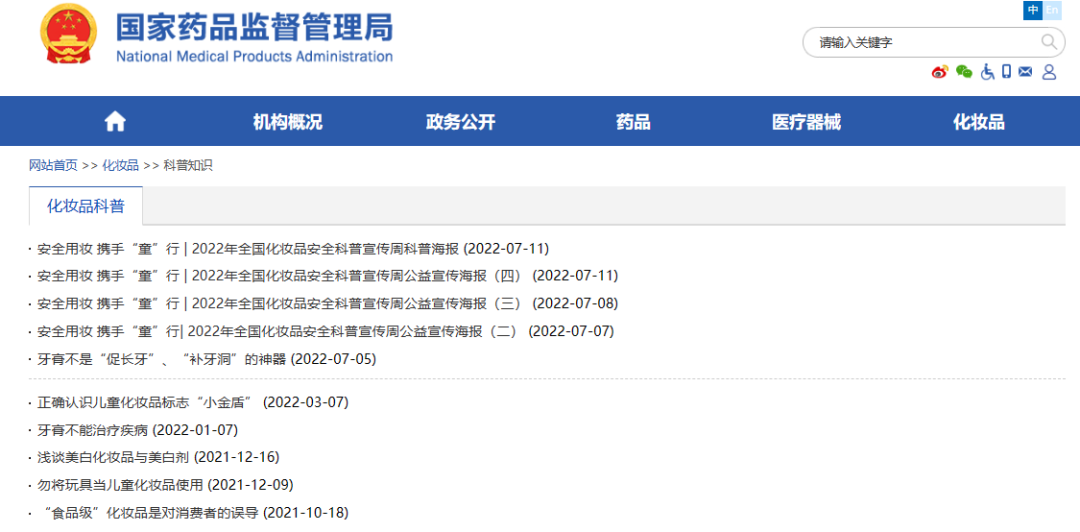 首先是來自國家層面的權(quán)威聲音?梢园l(fā)現(xiàn),在國家和地方藥監(jiān)局官網(wǎng)上均設(shè)有“科普知識”專欄,對廣大消費者給予適時適當(dāng)?shù)奶嵝。例如對于兒童化妝品中“小金盾”的認識、牙膏的規(guī)范宣稱、“干細胞化妝品”的宣稱等等,在市場混亂之時,監(jiān)管部門便及時“下場”警示消費者。