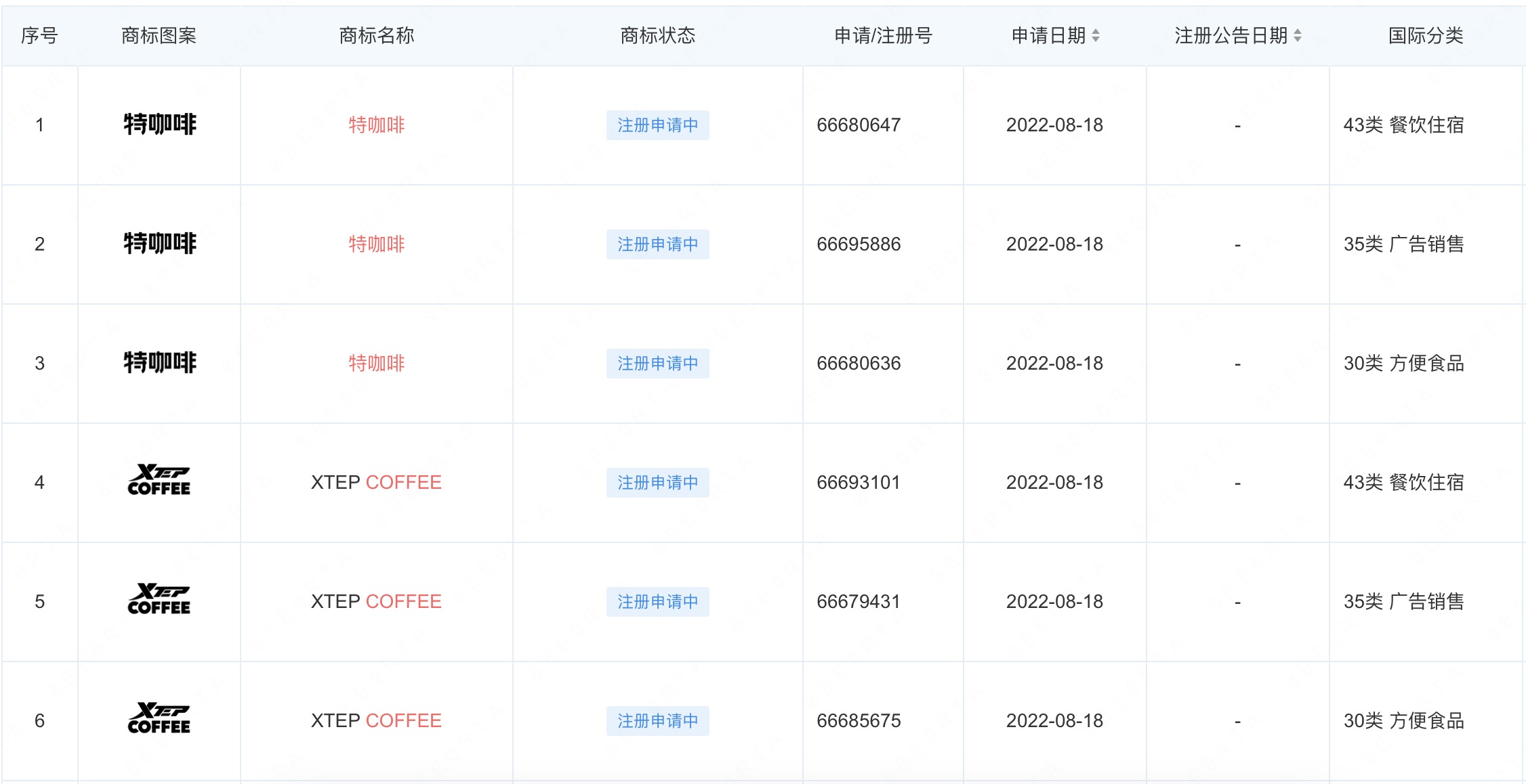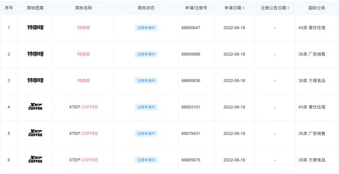 8月,天眼查信息顯示,特步共申請注冊6個咖啡相關商標,包含3個“特咖啡”商標以及3個“XTEP COFFEE”商標,目前上述商標均還在“等待實質審查”階段,暫未注冊成功。