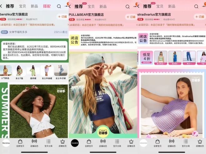 ZARA母公司Inditex旗下Bershka、Pull&Bear和Stradivarius三個品牌電商旗艦店發(fā)布閉店公告,自2022年7月31日起,線上商店將停止銷售。而在2021年初,上述三個品牌宣布全面關閉中國市場線下門店,并于2021年年底完成所有閉店工作。