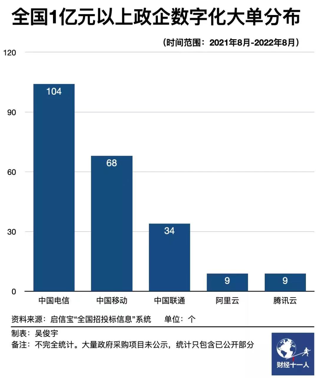 “根正苗紅”的新勢(shì)力浮出水面——三大電信運(yùn)營(yíng)商狂奔猛進(jìn),2022年上半年的云業(yè)務(wù)總和,已經(jīng)是兩個(gè)阿里云的體量。他們儼然有成為政企市場(chǎng)主力軍的雄心——據(jù)財(cái)經(jīng)雜志統(tǒng)計(jì),中國(guó)電信近1年來(lái)獲得的政企數(shù)字化大單就已有104個(gè),阿里同期只有9個(gè)。