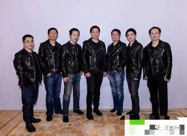 再來一個(gè)“大招”,2017年小米公司年會(huì)上,雷軍與其他幾位高管身穿皮夾克合影。圖中分別是黎萬強(qiáng)、劉德、洪鋒、雷軍、王川、黃江吉和林斌。