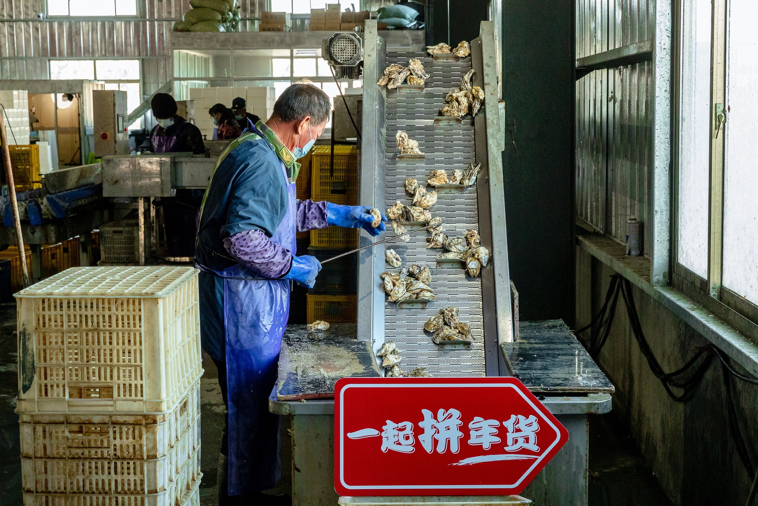 吳東平靜地掃視著從捕撈船上一瀉而下的生蠔,有的個(gè)頭比成年男性手掌還大。年貨節(jié)來了,每天清晨,他都得趕早去收蠔。