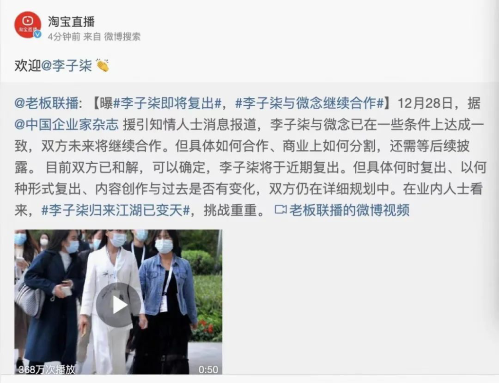 而就在李子柒與微念正式達(dá)成和解之時(shí),淘寶直播官方賬號(hào)也轉(zhuǎn)發(fā)了相關(guān)新聞,并@李子柒說:歡迎。這不僅佐證了上述猜測(cè),也透露了李子柒未來可能入駐淘寶直播。