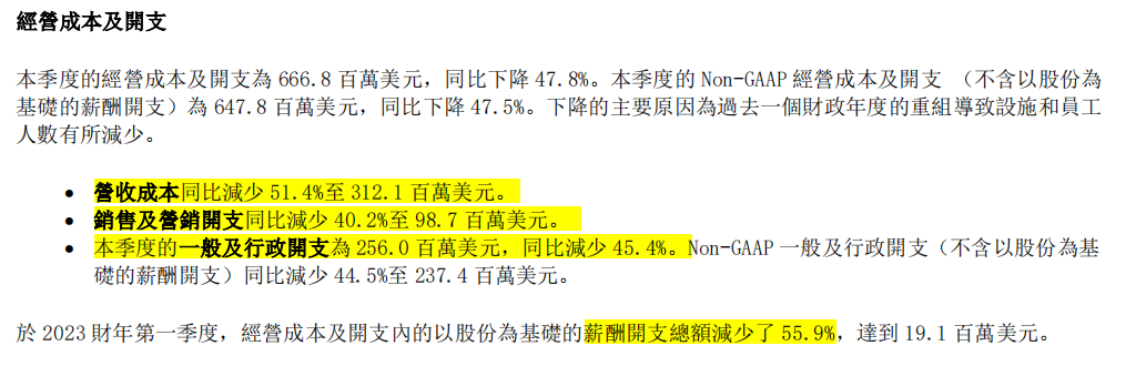 營收減少的同時,新東方的經(jīng)營成本也在同時下降。2023財年第一財季的新東方在營收成本同比減少51.4%,營銷成本和行政成本都同比減少了四成以上。