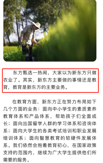 有觀點認(rèn)為東方甄選爆紅后新東方會轉(zhuǎn)型做農(nóng)業(yè),俞敏洪在個人公眾號“老俞閑話”中予以否認(rèn),并明確表示:“新東方主要做的事情還是教育,教育是新東方的主要業(yè)務(wù)。”