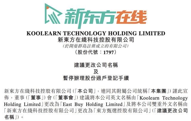 1月5日,新東方在線科技控股有限公司(簡稱“新東方在線”,01797.HK)公告,董事會建議將公司英文名稱由“Koolearn Technology Holding Limited”更改為“East Buy Holding Limited”及將公司雙重外文名稱由“新東方在線科技控股有限公司”更改為“東方甄選控股有限公司”。