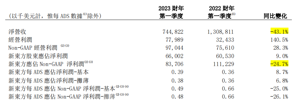 截至2022年8月31日的2023財年第一財季內(nèi),新東方營收7.45億美元,較去年同期減少43.1%。非美國通用會計準(zhǔn)則下的凈利潤為8371萬美元,同比下滑24.7個百分點。