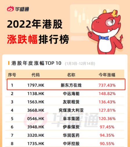 聚焦個股,漲幅最亮眼的便是新東方,位居2022年港股漲幅排行榜榜首,漲幅達到驚人的737.43%!