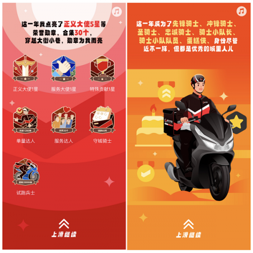 “迄今為止,我已成為城里人300天,曾到訪過6座城市,合計(jì)配送了9000KM,相當(dāng)于環(huán)繞故宮跑了80圈,這一年點(diǎn)亮了正義大使5星等榮譽(yù)勛章,獲得過最高的等級是黃金騎士,合計(jì)有30000人和我一起并肩作戰(zhàn)!边@是騎士小賈的年度個(gè)人專屬報(bào)告。