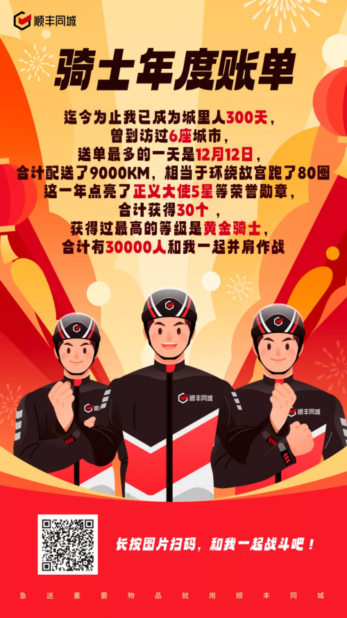 一直以來,順豐同城致力于打造一個(gè)好平臺,通過出臺多項(xiàng)舉措,使每名騎士認(rèn)同與熱愛自身的工作!巴球T士2022年度個(gè)人專屬報(bào)告”的推出,獲得了順豐同城騎士們的廣泛好評與踴躍分享。