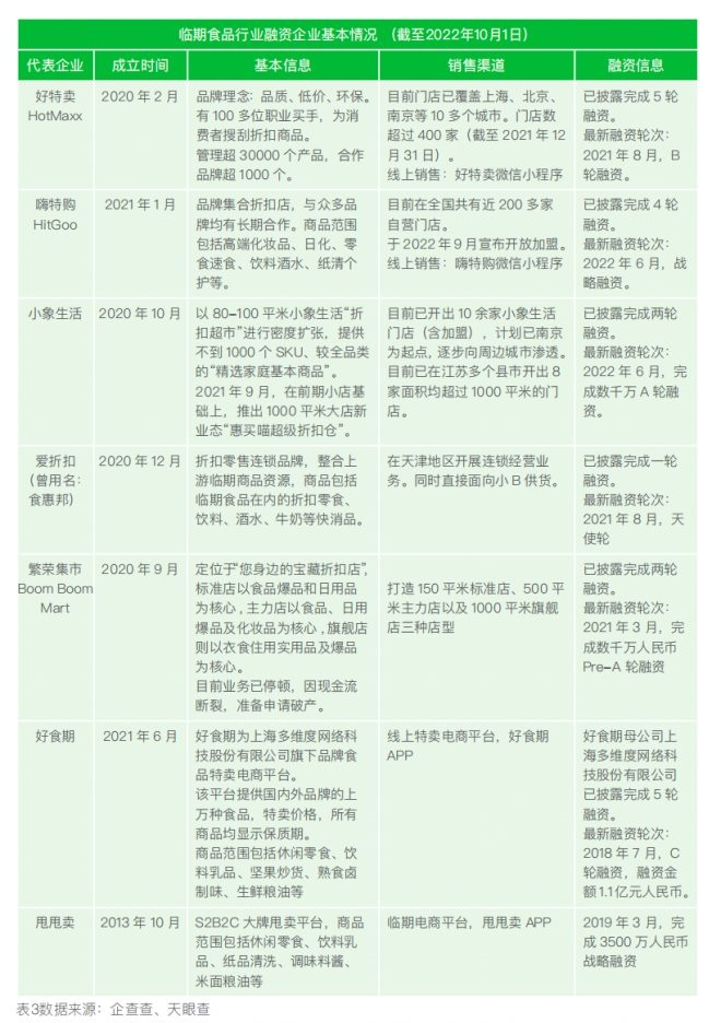第一類,以銷售臨期食品為主的折扣連鎖店,即臨期食品折扣店,例如好特賣HotMaxx、嗨特購HitGoo、小象生活;