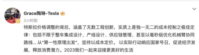 對(duì)于此次降價(jià),特斯拉對(duì)外事務(wù)副總裁陶琳表達(dá)了自己的看法(圖源:特斯拉官微)