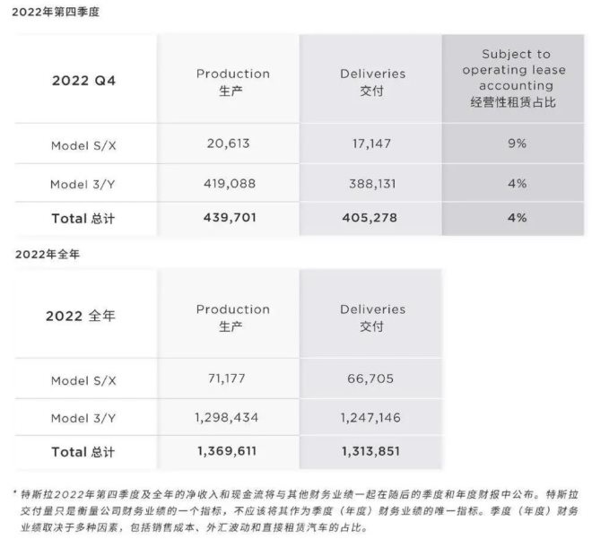 數(shù)據(jù)顯示,特斯拉2022年四季度產(chǎn)量為43.97萬輛,交付量為40.53萬輛創(chuàng)下新高——但這依舊低于市場(chǎng)預(yù)期,而且也沒能完成最后的沖刺。2022年全年,特斯拉產(chǎn)量超137萬輛,同比增長47%;交付量超131萬輛,同比增長40%,卻未能達(dá)成交付量同比增長50%的目標(biāo)(即137萬輛)。