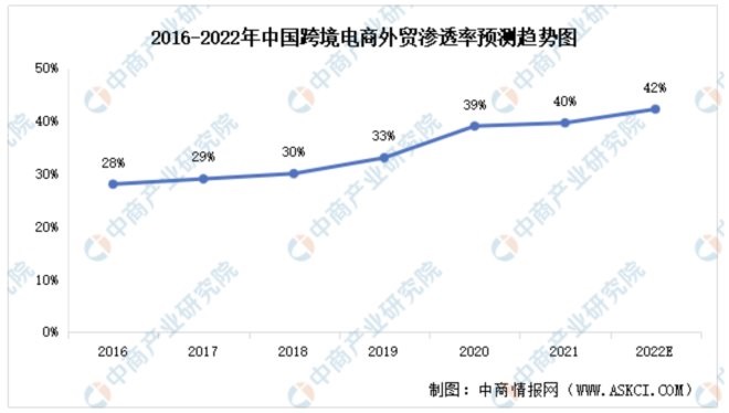 根據(jù)中商產(chǎn)業(yè)研究院報(bào)告,跨境電商在我國(guó)進(jìn)出口貿(mào)易總額中的滲透率逐年提升。數(shù)據(jù)顯示,我國(guó)跨境電商外貿(mào)滲透率由2016年的28%增長(zhǎng)到2020年的39%。預(yù)計(jì)未來,跨境電商在我國(guó)進(jìn)出口貿(mào)易中還將發(fā)揮越來越大的作用,2022年跨境電商外貿(mào)滲透率將達(dá)42%。