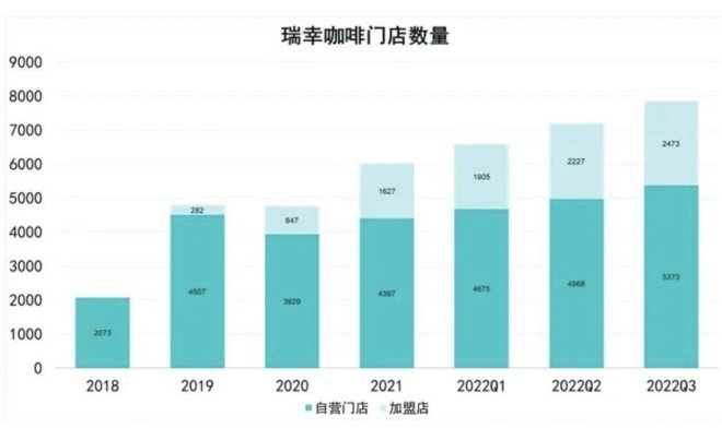 2021年,還處在自救中的瑞幸咖啡并未放棄發(fā)展,全年開店1248家。截至2022年第三季度末,瑞幸咖啡已開店7846家,其中自營(yíng)門店5373家,聯(lián)營(yíng)門店7846家,遠(yuǎn)超競(jìng)爭(zhēng)對(duì)手星巴克的6021家。