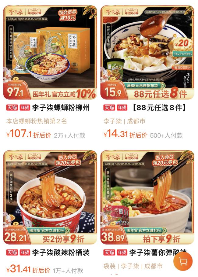 這一波操作下來(lái),可想而知,李子柒家相關(guān)的產(chǎn)品也要迎來(lái)一波新的營(yíng)銷熱潮。而且除了螺螄粉外,李子柒家也涉及酸辣粉、紅油寬面等產(chǎn)品,并且銷量也不低。