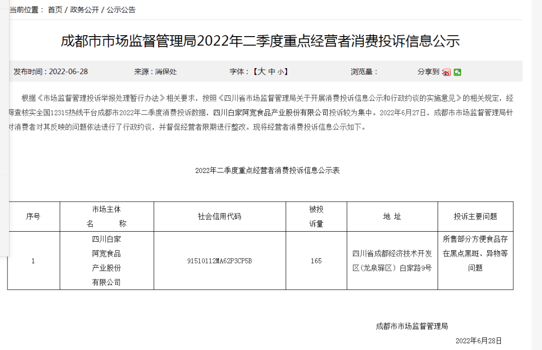 就在2022年6月白家阿寬沖刺IPO之際,便爆出了公司被成都市市場(chǎng)監(jiān)管局重點(diǎn)約談的事件,甚至還登上了投訴信息的公示板。
