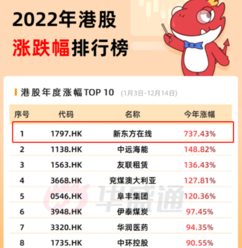 回望2022全年股市,港股整體表現(xiàn)不盡如人意,但此前遭遇重創(chuàng)的在線教育板塊卻迎來(lái)了股價(jià)復(fù)蘇,其中最亮眼的便是新東方,位居2022年港股漲幅排行榜榜首,漲幅達(dá)到驚人的737.43%。