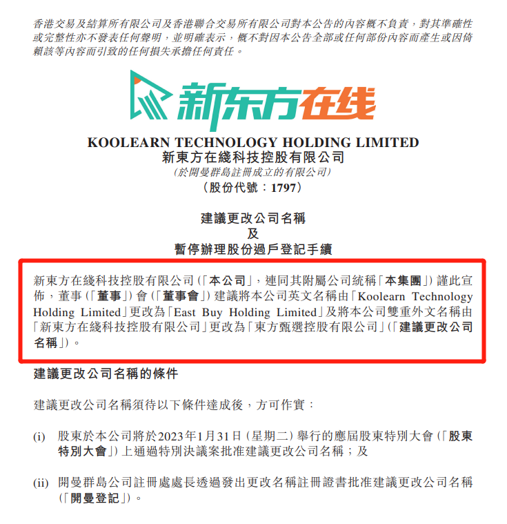 1月5日,新東方在線科技控股有限公司(以下簡(jiǎn)稱新東方在線)發(fā)布公告稱,董事會(huì)建議將公司英文名稱由“Koolearn Technology Holding Limited”更改為“East Buy Holding Limited”,并將該公司雙重外文名稱由“新東方在線科技控股有限公司”更改為“東方甄選控股有限公司”。