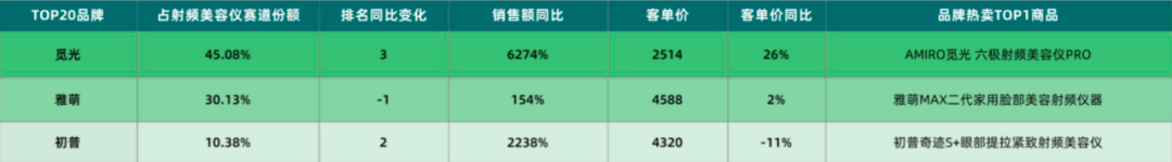 據(jù)果集數(shù)據(jù),抖音雙11美容儀銷售額中,射頻美容儀占85%市場份額,而在這其中,又有86%的市場份額由覓光、雅萌、初普三個(gè)品牌占據(jù)。覓光的排名則較去年提升3個(gè)名次,超越雅萌成為第一。