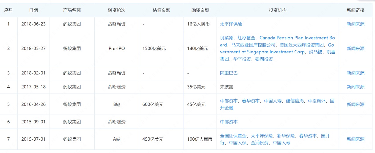 企查查數(shù)據(jù)顯示,從2015年7月開始,先后二十多家不同背景的機構(gòu),成為了螞蟻集團的一級市場投資方。三年時間,螞蟻集團的估值從450億美元膨脹至1500億美元,最多一次單次融資140億美元。