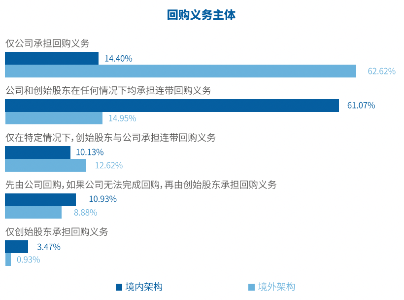 漢坤的數(shù)據(jù)亦顯示,采用境外架構(gòu)的VC/PE項(xiàng)目中,大多約定僅由公司承擔(dān)回購(gòu)義務(wù),而采用境內(nèi)架構(gòu)的VC/PE項(xiàng)目中,大多約定由創(chuàng)始股東和公司承擔(dān)連帶的回購(gòu)義務(wù),還有少數(shù)項(xiàng)目約定僅由創(chuàng)始股東承擔(dān)回購(gòu)義務(wù)。另外值得注意的是,在境外架構(gòu)的VC/PE項(xiàng)目中,約定僅由公司承擔(dān)回購(gòu)義務(wù)的項(xiàng)目也有所減少。