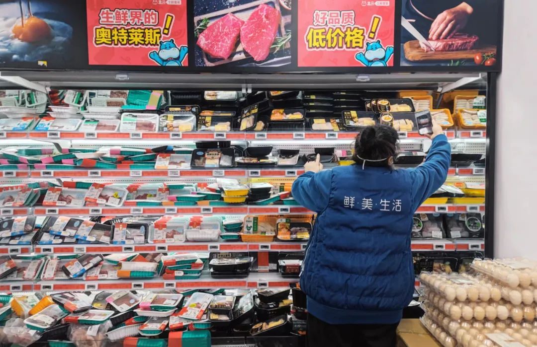 我們站在一旁,略顯生疏地使用掃碼工具對準(zhǔn)一盒排骨,16.95元,6折左右。老太太也湊過來看手機(jī)屏幕上的結(jié)果,而后似乎是徹底對豬肉失望了,推著灰色的小推車,轉(zhuǎn)身去了賣牛肉和雞肉的冷藏柜。