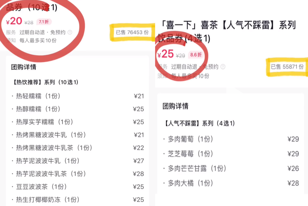 在喜茶和奈雪的北京線下門店,「新熵」觀察到,不同的團(tuán)購折扣策略讓實(shí)體店經(jīng)營產(chǎn)生了截然不同的表現(xiàn)。