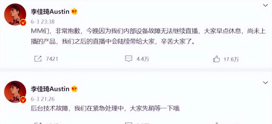 2022年6月3日李佳琦直播間突然停播,當(dāng)天晚上李佳琦發(fā)微博解釋稱,因?yàn)閮?nèi)部設(shè)備故障無法繼續(xù)直播,還稱會在今后的直播中陸續(xù)帶給大家尚未上播的產(chǎn)品。此后的幾天時間,李佳琦微博再無更新,在淘寶搜索“李佳琦”、“李佳琦的直播間”關(guān)鍵詞,已搜不到李佳琦的名字,以及相關(guān)的任何產(chǎn)品。