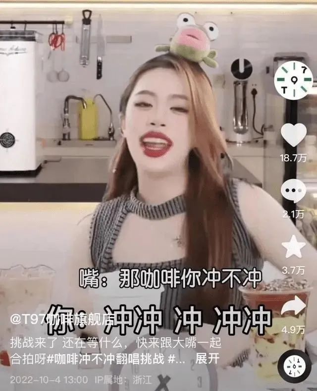 2022年9月,T97咖啡官方直播間以喊麥?zhǔn)街辈ケt,直播間內(nèi)同時在線觀看人數(shù)首次突破了10萬,主播大嘴妹一句“咖啡你沖不沖,沖沖沖沖沖。”成為了火遍全網(wǎng)的slogan,網(wǎng)友直呼“上頭”。踩在抖音扶持本地生活的流量紅利,大嘴妹順勢成為了為線下門店帶貨的頂流。隨之,該品牌賬號不到2個月漲粉147萬,場觀更是連續(xù)幾日突破百萬。