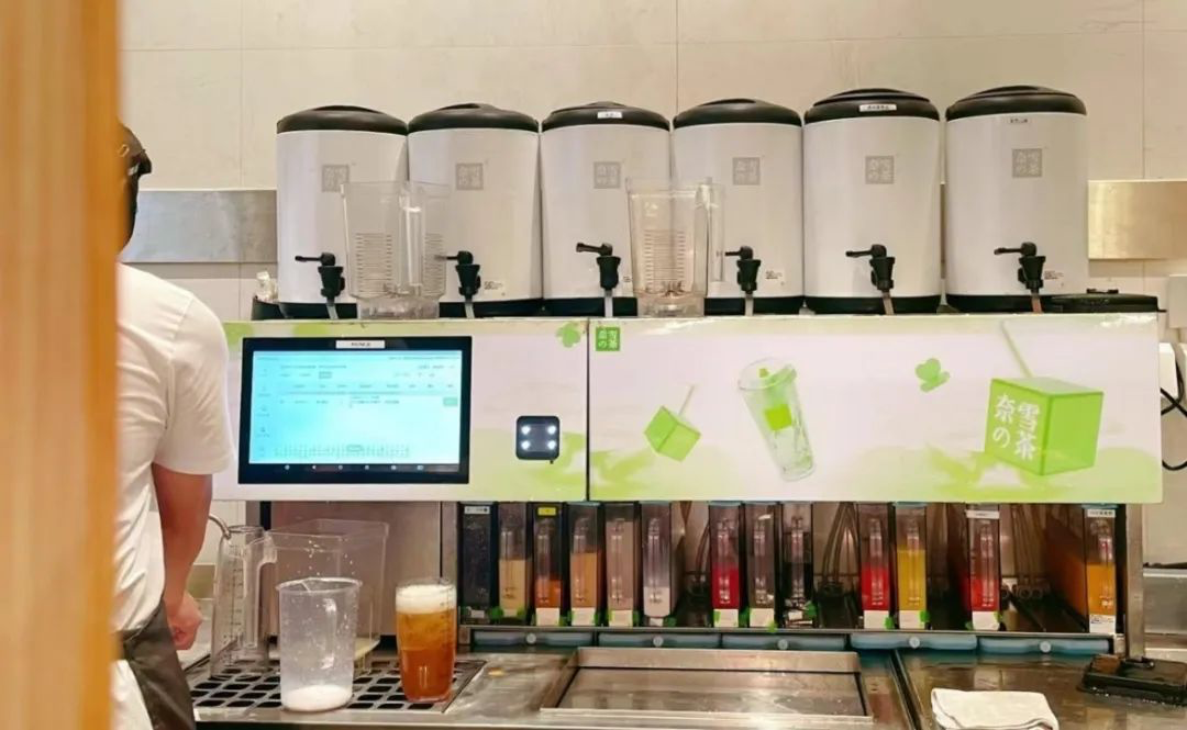 該機(jī)器上接茶桶下連果汁瓶,中段有一塊電子屏和一個(gè)掃碼口。消費(fèi)者下單后會(huì)生成一張帶二維碼的紙單,同時(shí)電子屏幕上也出現(xiàn)幾行選項(xiàng)(應(yīng)為類別、甜度、冰度),店員將二維碼紙單貼在茶飲杯上,對(duì)準(zhǔn)身后機(jī)器的掃碼口,隨即在電子屏幕上選點(diǎn)按鍵,屏幕下方的出料口依次配置出茶湯、果汁等液態(tài)基底。機(jī)器可以識(shí)別訂單準(zhǔn)確調(diào)配茶湯、果汁等原料,不到10秒即可完成一杯茶飲的制作,單人每小時(shí)產(chǎn)能提升約40%。同時(shí),奈雪的自動(dòng)奶蓋機(jī)、自動(dòng)茶湯勻質(zhì)器等系列設(shè)備也在推進(jìn)中,F(xiàn)泡茶、手搖茶、打奶蓋、手工去核剝皮等工序強(qiáng)調(diào)手作與新鮮,但制作流程復(fù)雜。自動(dòng)化制茶設(shè)備的應(yīng)用,有利于門店解放人力,并提升人力資源效率。