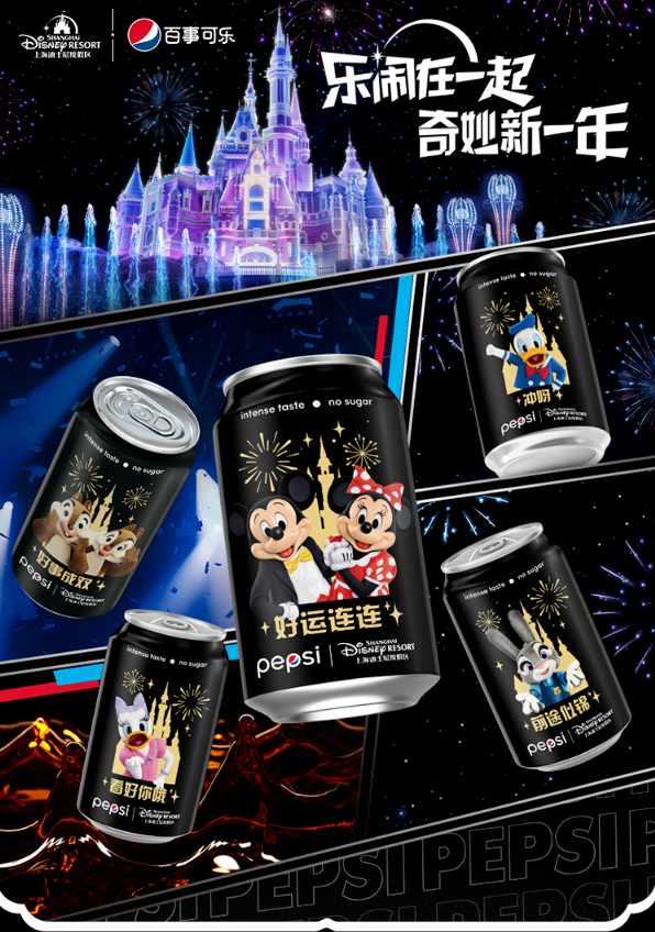 1月5日,百事可樂無糖系列聯(lián)名迪士尼上線卡通mini罐,新品規(guī)格為200mL,包裝上印有米奇米妮、朱迪、唐老鴨、黛西、奇奇蒂蒂的卡通形象,并附有好事成雙、前程似錦等花樣祝福語,慶祝新年來臨。天貓旗艦店原售價200mL*8罐/29.9元、200mL*24罐/69.9元。