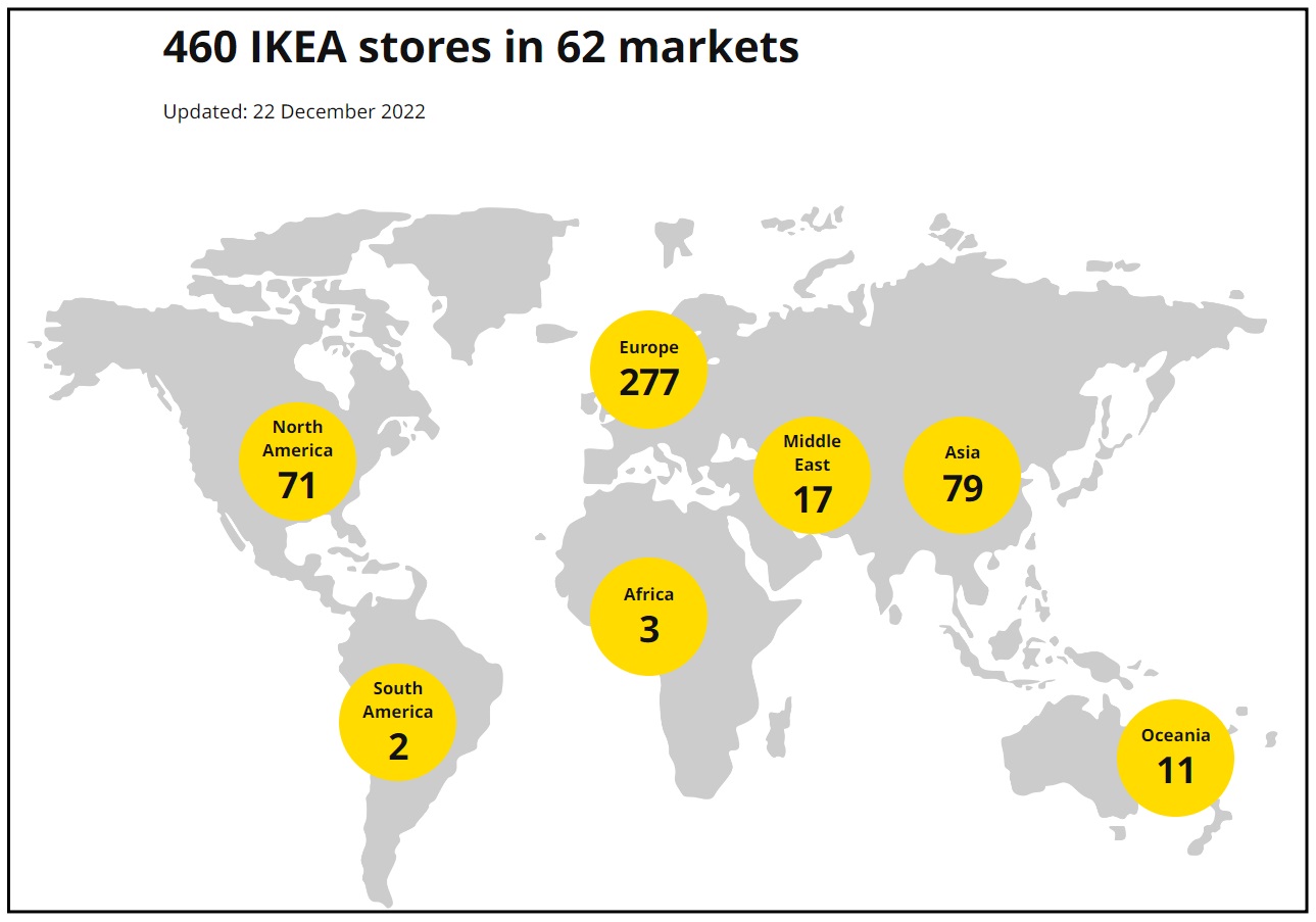 截至2022年12月,宜家家居全球門店數(shù)量分布情況。圖源:IKEA官網(wǎng)