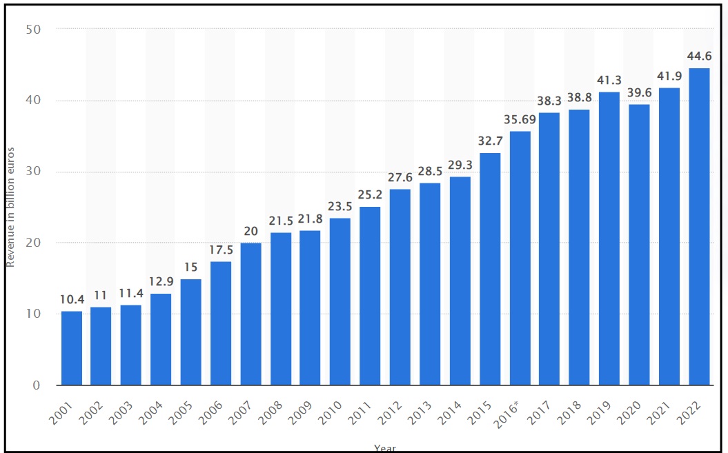 2001年至2022年,宜家家居全球年收入(單位:十億歐元)。圖源:Statista