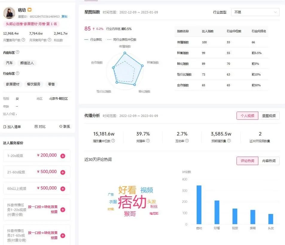 從2020年火爆至今,痞幼用人設與內容轉型吸粉超過2940萬。作為抖音頂流,痞幼目前的主要變現(xiàn)方式還是在廣告和櫥窗帶貨上。近90天發(fā)布了42條星圖視頻,按照報價50萬來估算,收入就能達到在2100萬元。