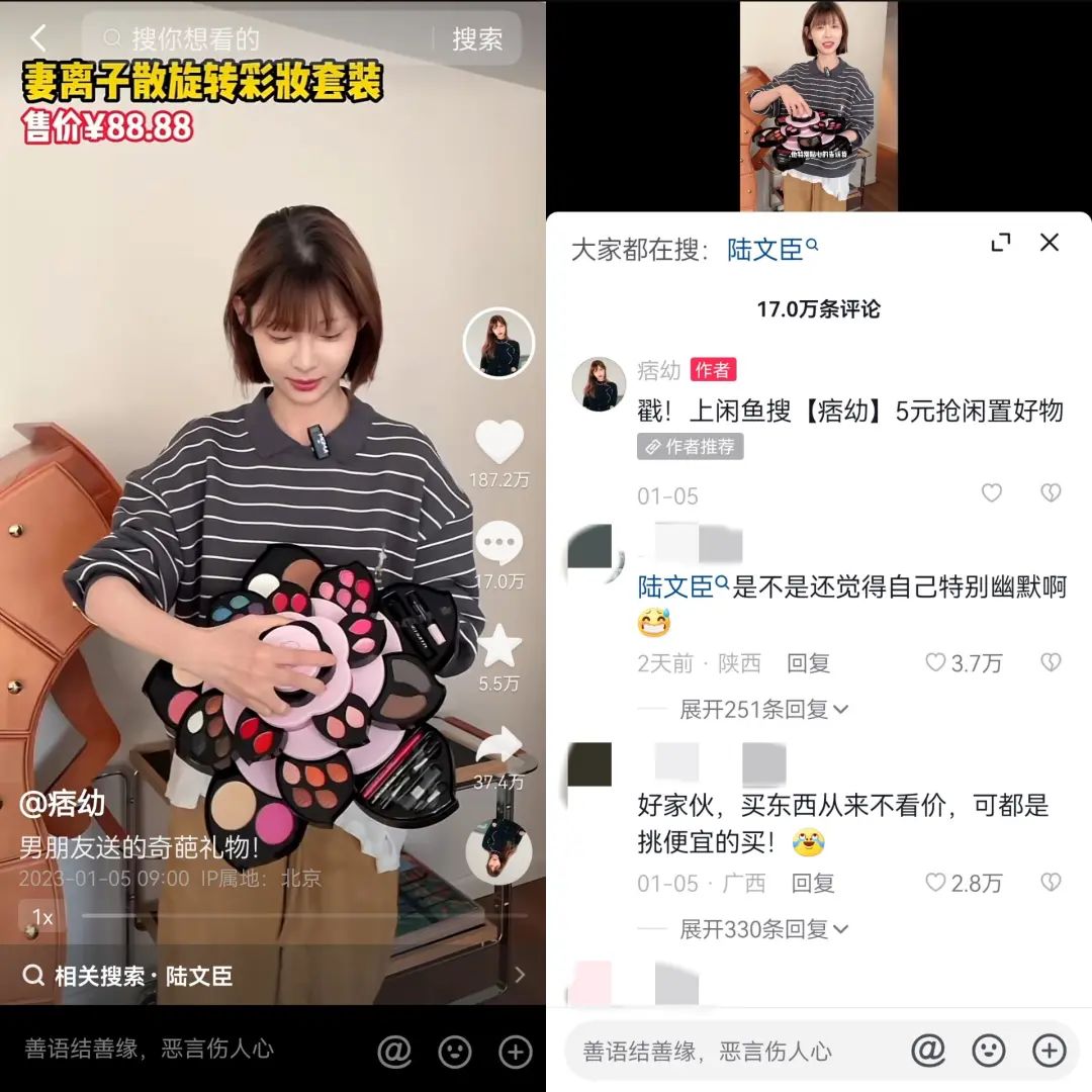 另一方面,這可能也是痞幼為自己鞏固人設和打造新內容做鋪墊,官宣男友的極限運動俱樂部與痞幼之前打造的運動少女人設契合,勇敢追愛的表白也讓痞幼打造的“敢想敢做”人設更加豐滿。近期痞幼的多條視頻都提及到陸先生,一條閑魚廣告短視頻主題變成了收到老陸的奇葩禮物,最后表示自己已經把這些放在閑魚上轉賣了,點贊數(shù)量也達到了188萬。
