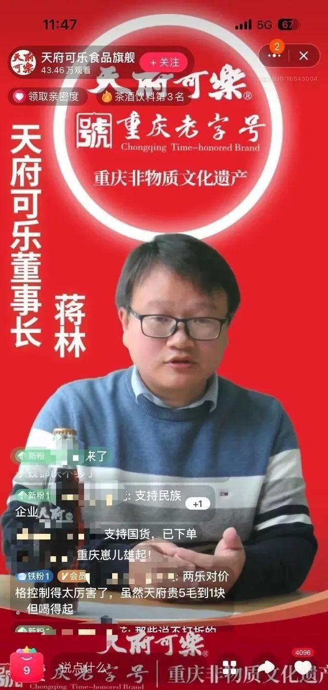 在直播時蔣林也表示,在20世紀八九十年代,天府可樂在中國可樂市場的占有率達到75%,是當時中國可樂的第一品牌。