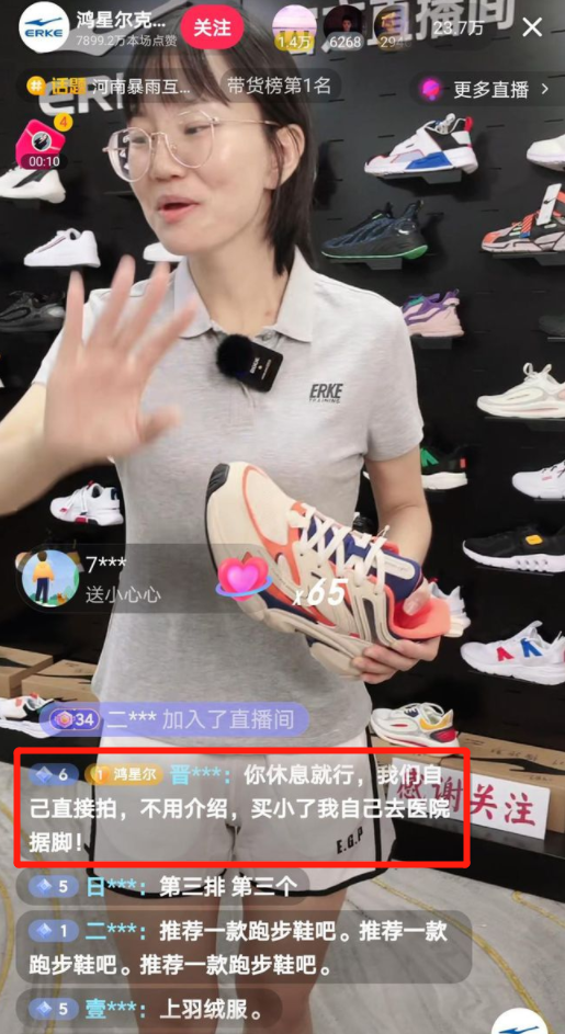 在整個7月,鴻星爾克9個品牌矩陣賬號同時開播,單月累計帶貨超2.1億,23場直播的場均觀看人次超1100萬,主賬號“鴻星爾克品牌官方旗艦店”更是創(chuàng)下了單月1.1億的銷售額,GMV占比超過50%。