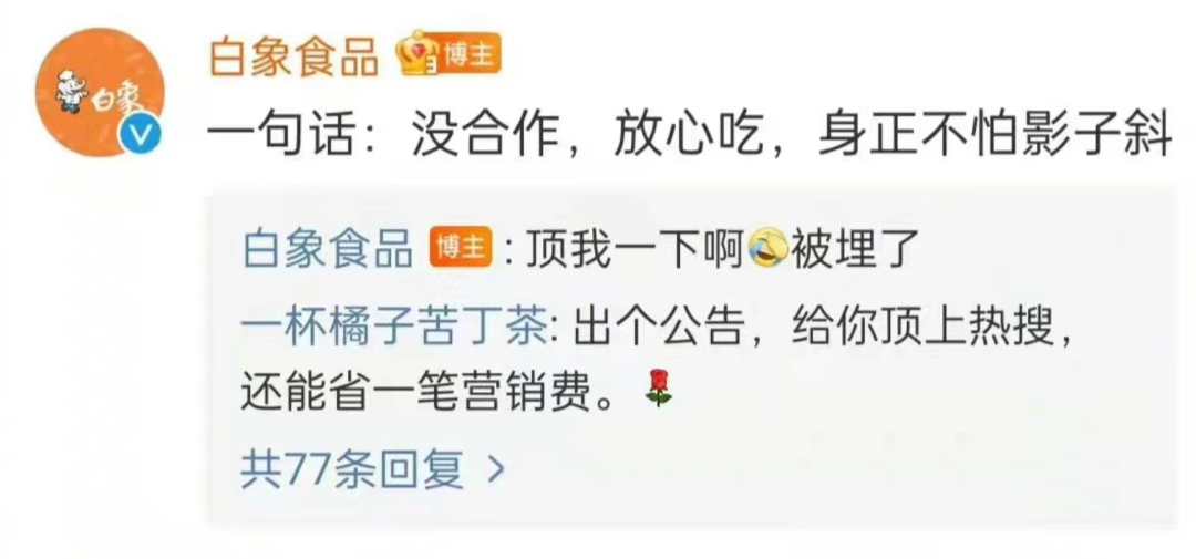 2022年“315”晚會后,,康師傅、統(tǒng)一皆因“土坑酸菜”翻車,在消費者的質疑下白象直接表示,“一句話,沒合作,放心吃,身正不怕影子斜。”一時間,成立25年的白象再次站到了消費者的面前。