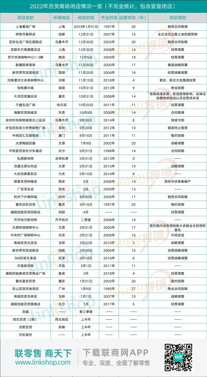 根據(jù)《聯(lián)商網(wǎng)》不完全統(tǒng)計(jì),2022年,至少有42家百貨門店發(fā)文告別。