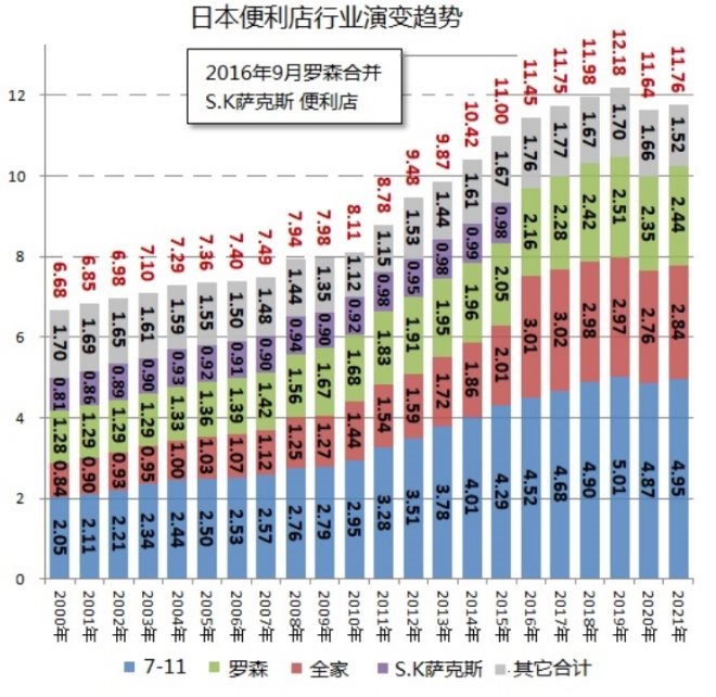 日本便利店在2000年以后一段時(shí)期處于四大品牌分天下的局面,在商品更新開發(fā)、消費(fèi)者服務(wù)方面,7-11優(yōu)勢卓越、在行業(yè)一家獨(dú)大。羅森在較長時(shí)期銷售額排第二位置,但是在2016年羅森整合s.k薩克斯便利店以后,改為三巨頭壟斷市場,羅森排在7-11、全家之后,穩(wěn)居江湖第三把交椅。