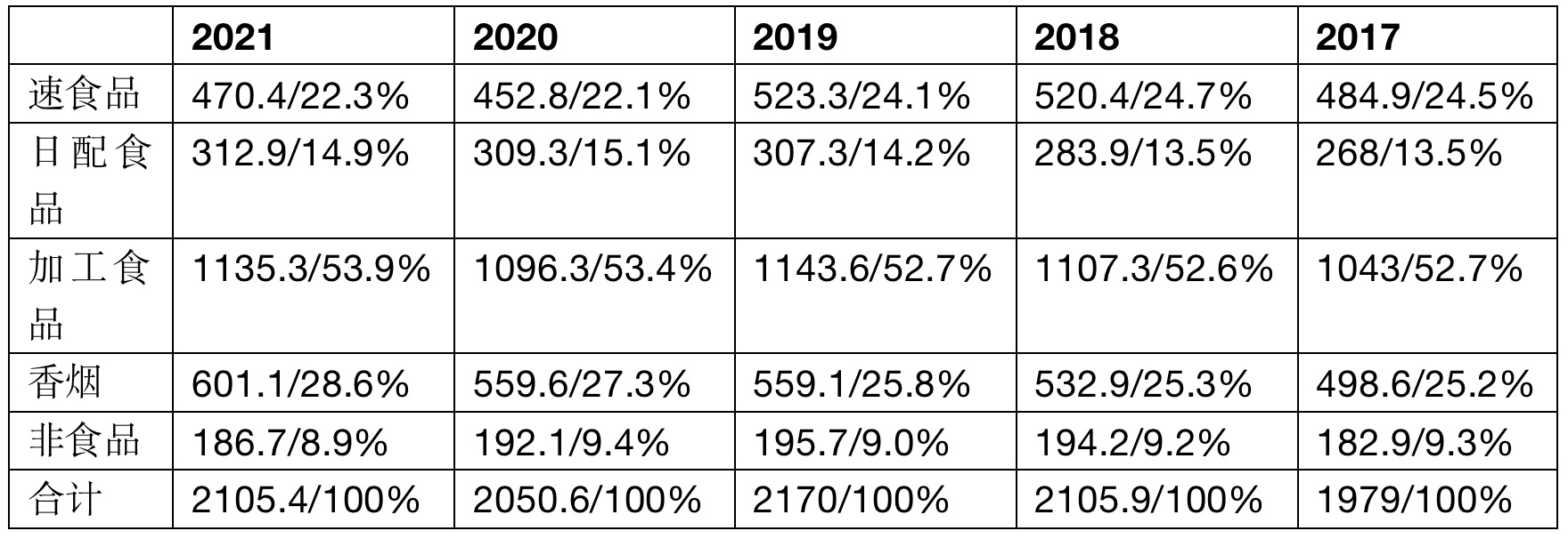 品類商品群銷售結(jié)構(gòu)演變。從2004年到2022年有以下變化:一是速食品比例基本穩(wěn)定,略有縮小。2004年為23.5%,2022年為22.3%。二是日配食品結(jié)構(gòu)有增加的趨勢。2004年為10.8%,2022年為14.9%。三是外購加工食品逐漸縮小。從2004年的34%,減少到2022年的25.3%,內(nèi)部加工食品有較大增長,整體看加工食品處于增長趨勢。四是香煙的銷售比例在擴(kuò)大。從2004年的14.5%,擴(kuò)大到2022年28.6%。